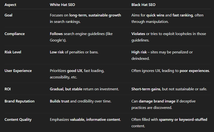 - Sustainable Long-Term Results – White Hat SEO may take longer to show results, but the gains are long-lasting.